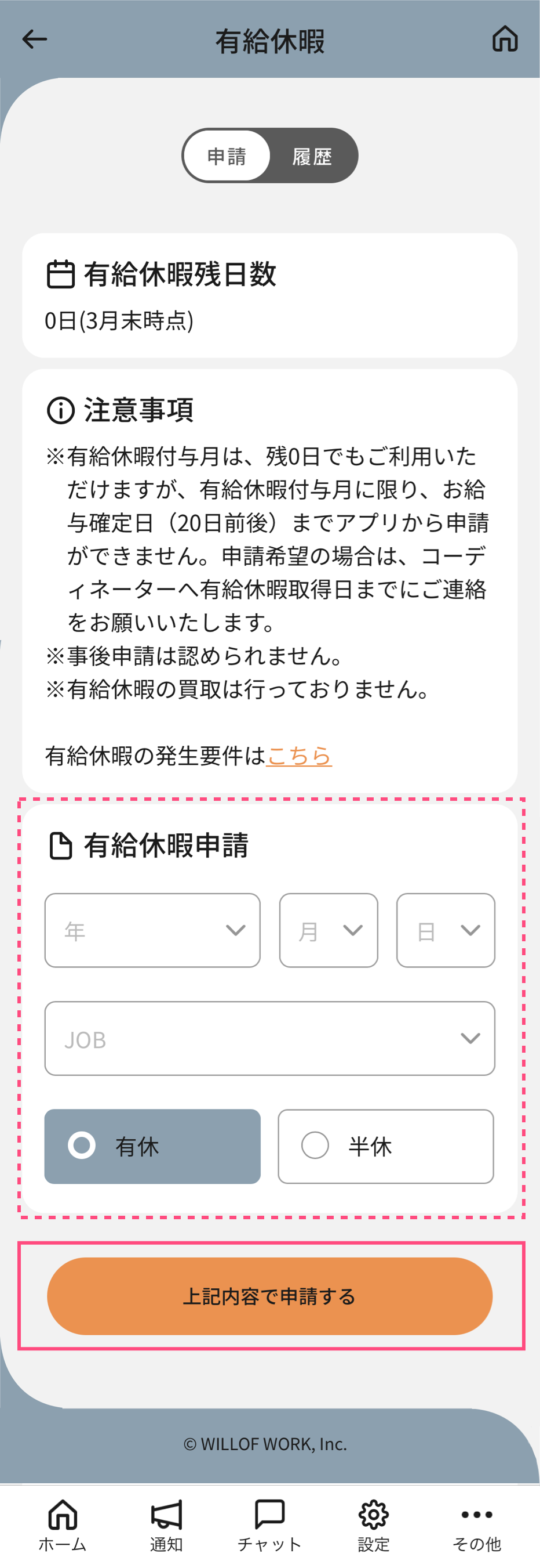 [有給取得申請]画面より・日付・JOB・区分:有休/半休を入力して「上記内容で申請する」をクリックする。